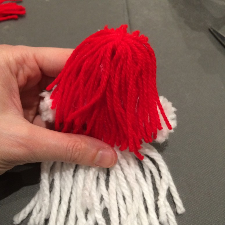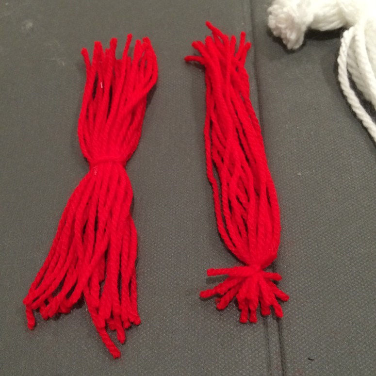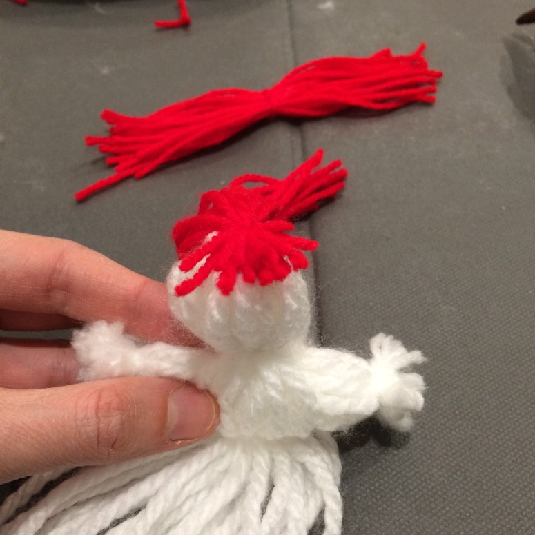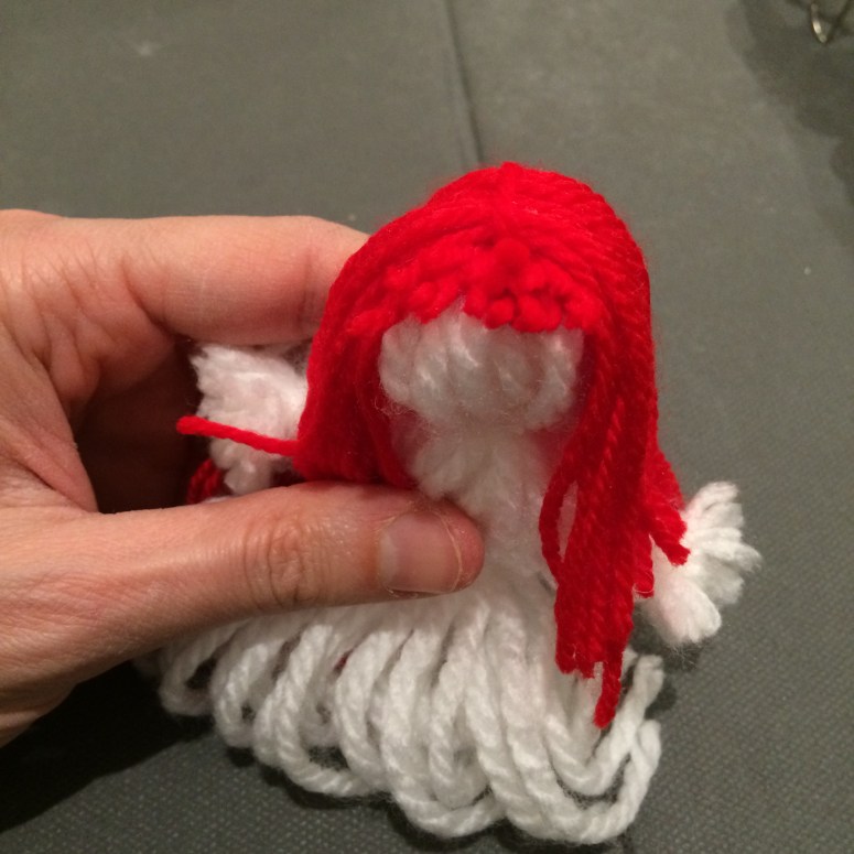 First glued on head the skein fixed at one end and then the other one. Finally level the red wires with scissors.