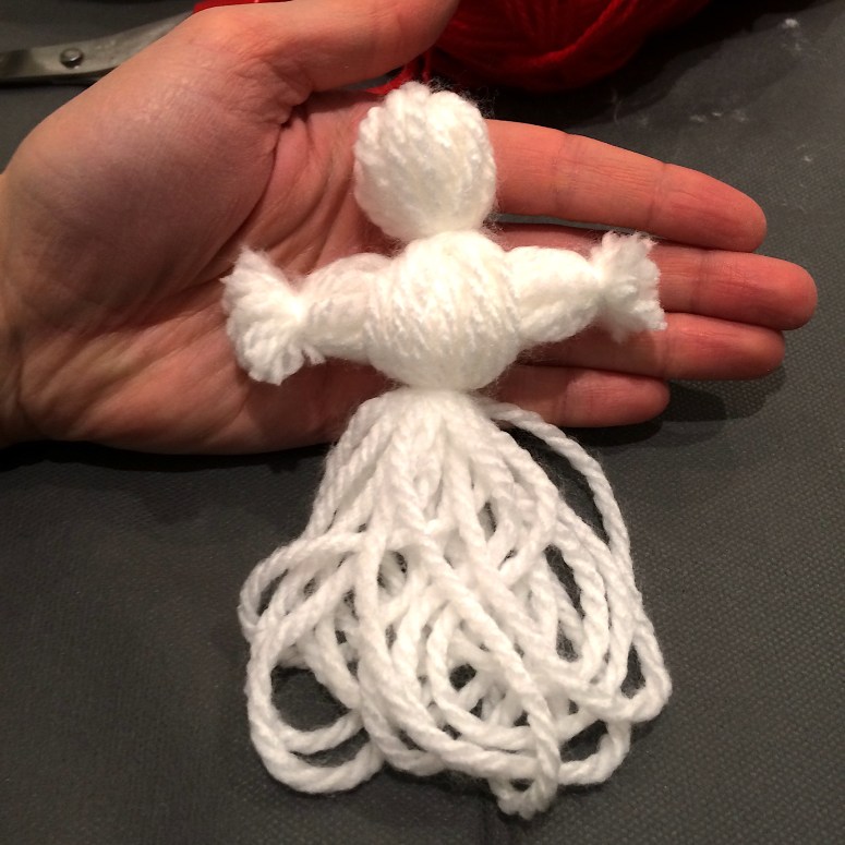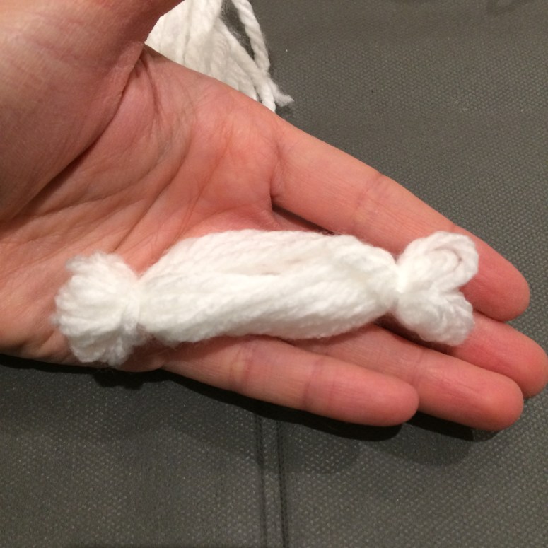 Ripetete lo stesso procedimento per realizzare le braccia, questa volta però dovrete annodare con del filo le due estremità opposte per creare le mani della bambolina. Aprite con le forbici le estremità che formano le mani e livellate i fili di lana alla stessa lunghezza.