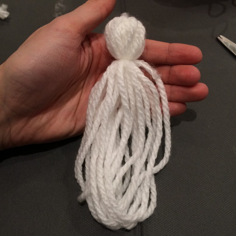 Per creare una gonna più ampia create un’altra matassa di lana bianca con il stesso procedimento iniziale e poi incollate questa nella parte sottostante il girovita livellando i fili con le forbici.